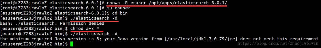 # chmod 777 /opt/apps/elasticsearch-6.0.1/ //在esuser用户下执行该操作,对该路径下文件权限做变更