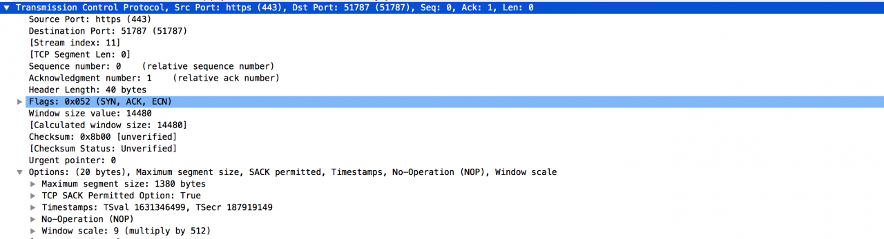 但是,在三次握手过程中,除了要协商连接的建立,还有其他通讯参数的设置。下面以一个真实请求在三次握手过程中发生的数据交换作说明: