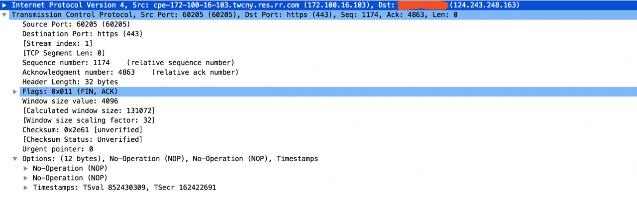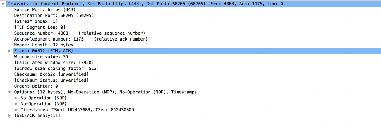 下面是三次握手实现的连接断开的报文传输细节:
