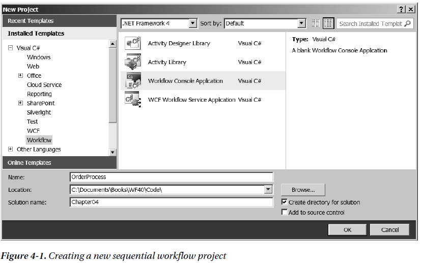 创建一个新的Workflow Console Application,如图Figure4-1。命名这个项目为OrderProcess,同时命名这个解决方案为Chapter04。