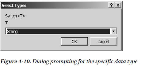 Switch活动的工作原理跟C#中的switch类似。它允许你执行一系列的活动根据表达式的值。你将会使用Switch活动去验证ShippingMethod而去决定收费。在Toolbox中,Switch活动显示为Switch<T>。这意味着他是一个模板类和他可以操作不同的数据类型。拖放一个Switch活动到Assign活动的下面。你应该可以看到弹出了一个对话框,如图Figure4-10所示,这个对话框要求你指定数据类型。ShippingMethod是一个string类型,因此选择String类型。