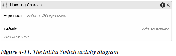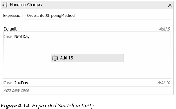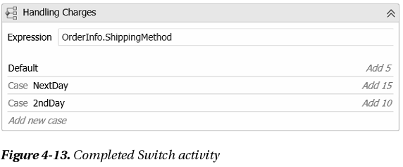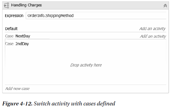 Switch活动有一个Expression属性,一个default分支,和一些用户定义的分支。输入expression为OrderInfo.ShippingMethod。点击Add new case链接(在活动的底部)。输入case的值为NextDay。再次点击Add new case,输入case为2ndDay。这时活动如图Figure4-12所示。