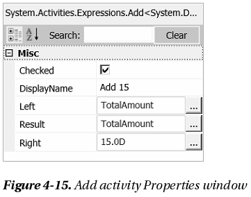Add活动有三个属性:Left,Right和Result。Right的值加上Left的值然后赋值给Result属性,Left和Result属性设置为TotalAmount参数,Right属性被指定为一个常数。