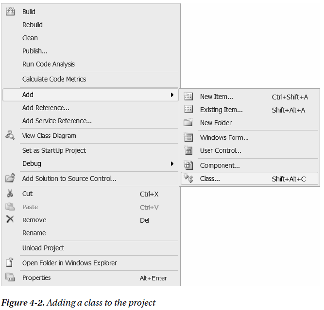 第一步是定义订单的数据类型。在Solution Explorer(解决方案)中右击项目,选择Add > Class,如图Figure4-2所示。