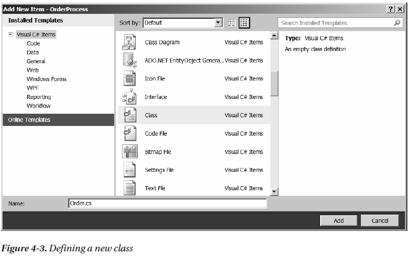 在Add New Item对话框中(如图Figure4-3),选择Class模板(它应该已经被默认地选择了),指定它的名字为Order.cs,点击Add。