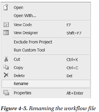 模板为我们创建了一个工作流文件,名叫Workflow1.xaml。在Solution Explorer中,右击Workflow1.xaml文件,选择Rename(重命名),如图Figure4-5所示。命名为OrderWF.xaml。