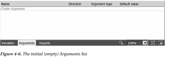 提示:你可能会想起第一章中定义variables时是需要指定范围的,范围可能是整个工作流或者是特定的一个活动(和他的子活动)。对于arguments,然而,是不需要定义范围的,因为它已经被默认的指定为对整个工作流有效,因为它是指定来传入传出数据到工作流的。因此,当定义argument是是没有Scope属性的。
