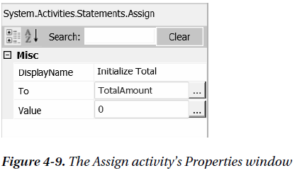 现在你可以设计活动来处理传进来的订单了。首先拖拉一个Sequence活动到工作流设计器上,然后拖放一个WriteLine活动到Sequence中。设置Text属性为“Order Received”。拖放一个Assign活动到WriteLine活动的下面。设置DisplayName为Initialize Total。To属性为TotalAmount,Value属性为0。Assign的属性窗口如图Figure4-9所示。