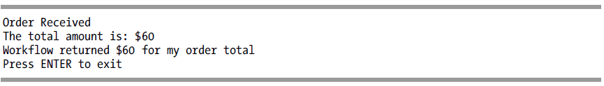 Console.WriteLine("Workflow return ${0} for my order total", total);
