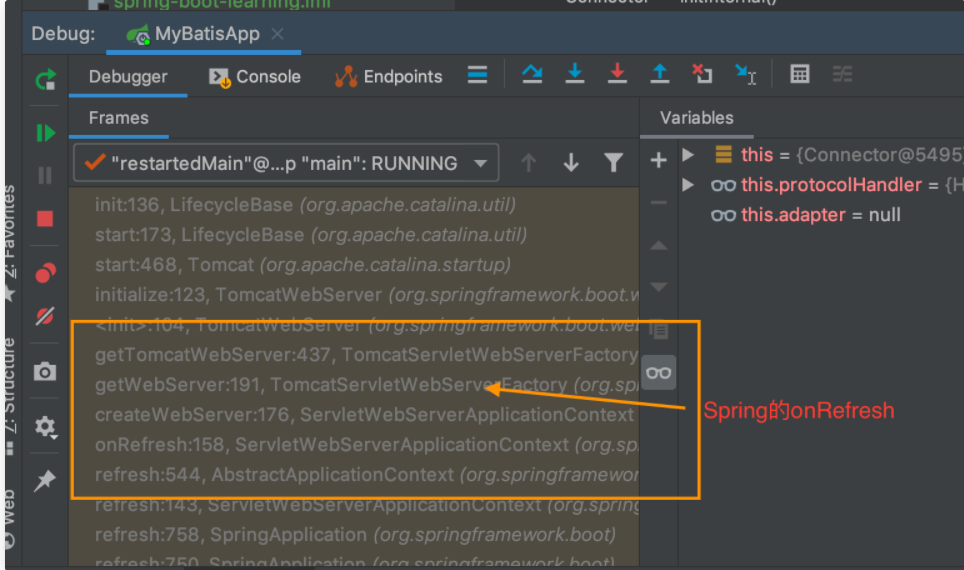按照这个思路,我在Tomcat的Connector组件的init方法上打了端点,通过调用栈能很清楚的看出Spring Boot是在容器的onRefresh方法中调用Tomcat的。
