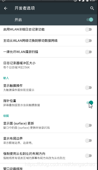 Monkey脚本只能通过坐标的方式来定位点击和移动事件的屏幕位置,这里就需要提前获取坐标信息。获取坐标信息的方法很多,最简单的方法就是打开手机中的开发人员选项,打开“显示指针位置”。随后,在屏幕上的每次操作,在导航栏上都会显示坐标信息。