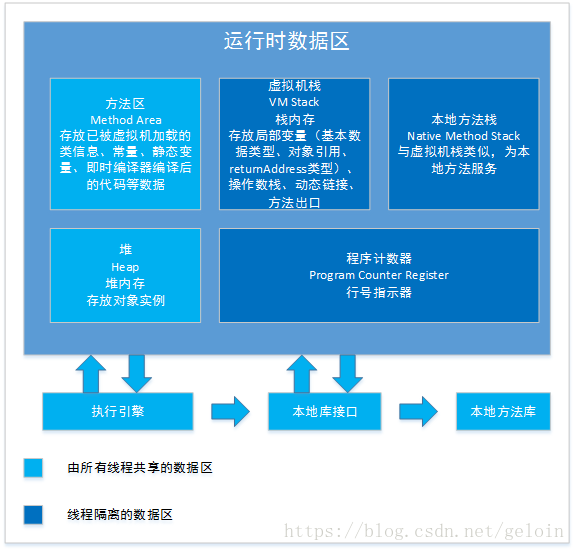 Java虚拟机在执行Java程序的过程中会把它所管理的内存划分为若干个不同的数据区域,这些区域都有各自的用途以及创建和销毁的时间,有的区域随着虚拟机进行的启动而存在,有些区域则依赖用户线程的启动和结束而建立和销毁。根据《Java虚拟机规范(Java SE 7版)》的规定,Java虚拟机所管理的内存将会包含以下几个运行时数据区域: