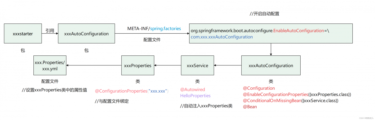 - autoconfigure包中配置使用 META-INF/spring.factories 中 EnableAutoConfiguration的值,使得项目启动加载指定的自动配置类