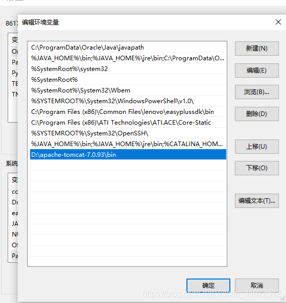 3、Tomcat环境变量配置,右击计算机——属性——高级系统设置——高级,进入高级中的环境变量,在系统变量中新建变量CATALINE_HOME,并填写其值为Tomcat安装路径,本人的是D:\apache-tomcat-7.0.93,在系统变量Path中——编辑——新建,在光标处填写:D:\apache-tomcat-7.0.93\bin,然后一路确定即可。