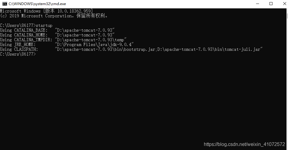 4、win+R打开DOS窗口,输入startup命令,按回车键,若出现下图所示,则表示配置成功。