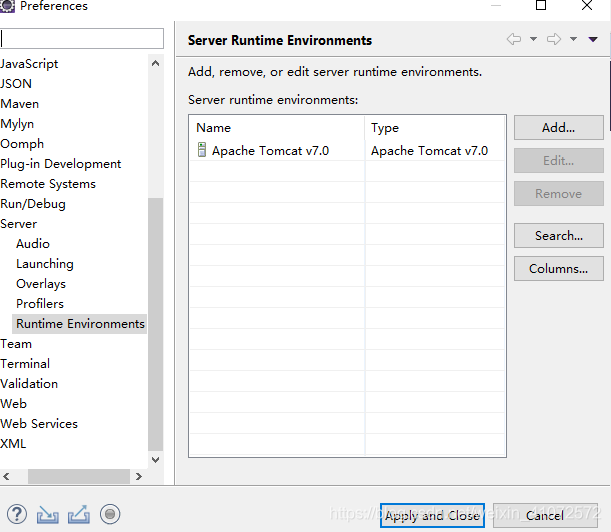 点击Runtime Environments之后,在右侧弹出的对话框内点击Add,选择自己安装的版本号,我这里是Tomcat7.0,选择好之后点击Next,选择浏览Tomcat的安装目录,我这里是D:\apache-tomcat-7.0.93,然后点击完成,最后点击Apply and Close即可。
