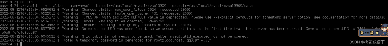 ./mysqld --initialize --user=mysql --basedir=/usr/local/mysql/mysql3309 --datadir=/usr/local/mysql/mysql3309/data--user 是当前用户名。我是mysql用户名所以写的mysql