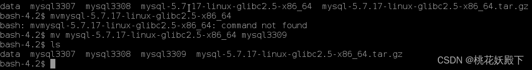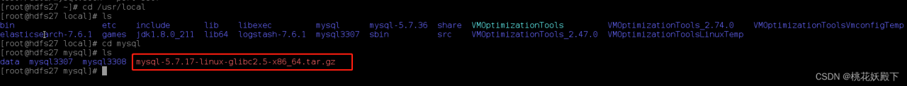 wget https://dev.mysql.com/get/Downloads/MySQL-5.7/mysql-5.7.17-linux-glibc2.5-x86_64.tar.gz下载过程就不截图了,因为我之前下载好了,就用通用部署的地方/usr/local/mysql文件夹里,我们到时候要在这里部署多个mysql按文件夹区分,这里看到我已经弄好了3307和3308,所以接下来准备3309