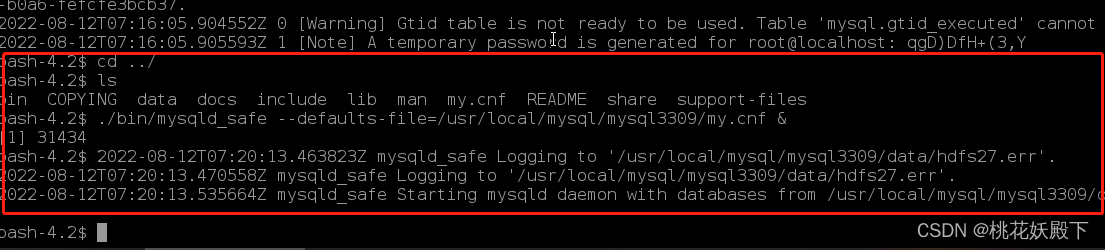 ./bin/mysqld_safe --defaults-file=/usr/local/mysql/mysql3309/my.cnf & mysql_safe启动,指定自己单独的my.cnf配置,这里注意,mysql_safe启动命令官方文档更新说明不许在bin目录下启动了,而是在根目录下用./bin去启动,出现我图片结果就成功了