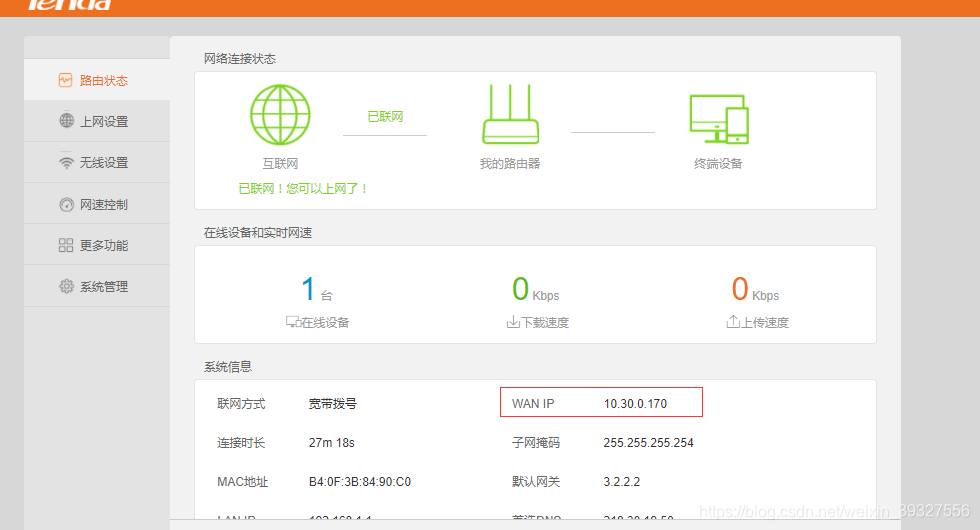 2、看到WAN IP就是公网ip,但是这个ip不一定就是真正的公网,有可能是运营商提供给你的私有IP