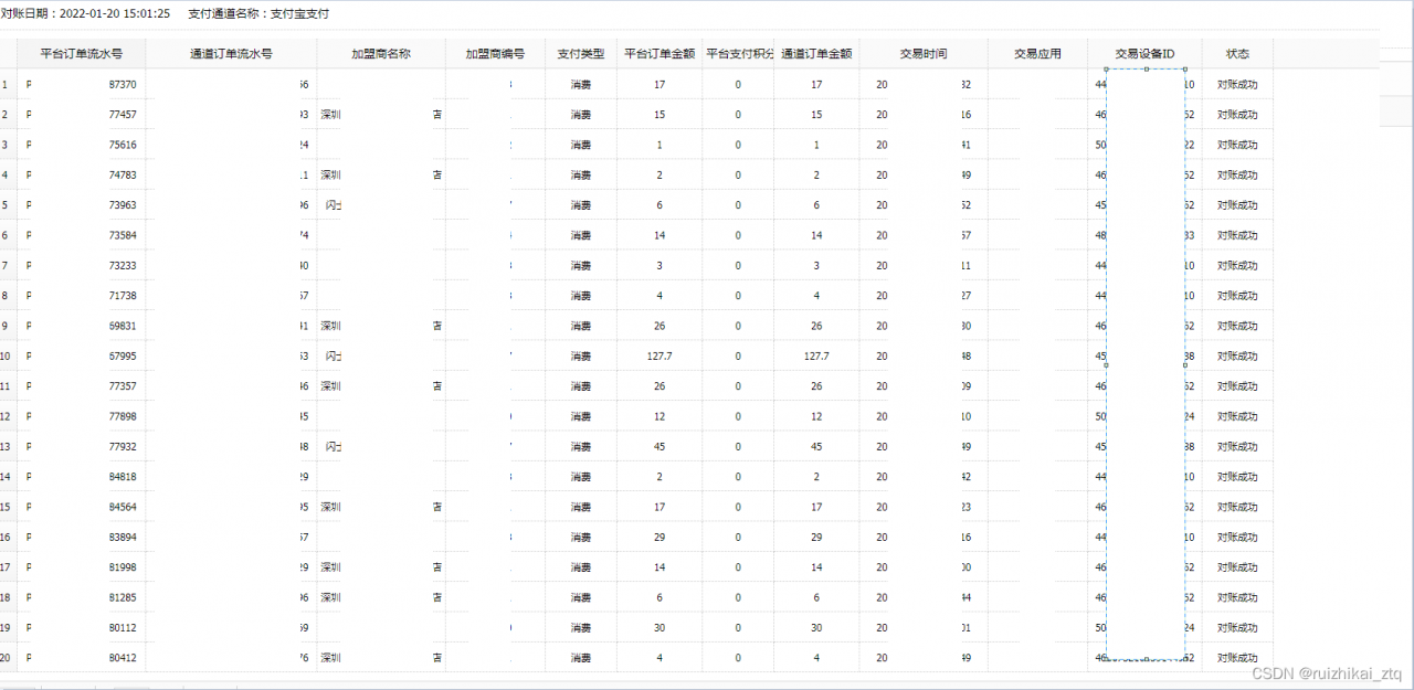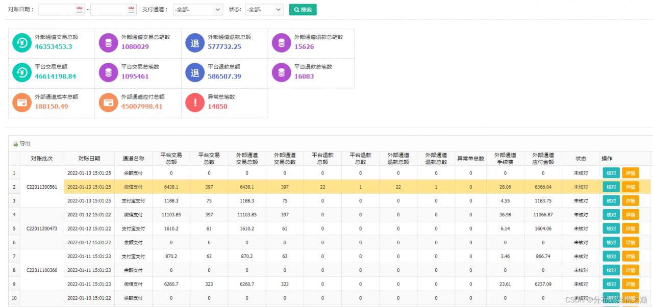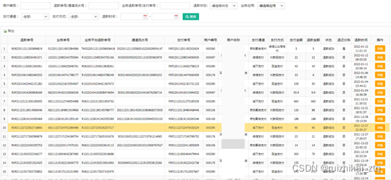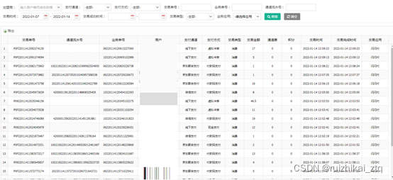汇总各支付渠道的交易流水:交易单号、通道流水号、业务单号、支付通道、支付方式等信息