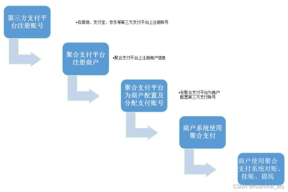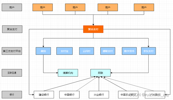 聚合支付(IntegrationPayment):也称“融合支付”,是指从事“支付、结算、清算”服务之外的“支付服务”,依托银行、非银机构或清算组织,借助银行、非银机构或清算组织的支付通道与清结算能力,利用自身的技术与服务集成能力,将一个以上的银行、非银机构或清算组织的支付服务,整合到一起,为商户提供包括但不限于“支付通道服务”、“集合对账服务”、“技术对接服务”、“差错处理服务”、“金融服务引导”、“会员账户服务”、“作业流程软件服务”、“运行维护服务”、“终端提供与维护”等服务内容,以此减少商户接入、维护支付结算服务时面临的成本支出,提高商户支付结算系统运行效率的,并收取增值收益的支付服务。