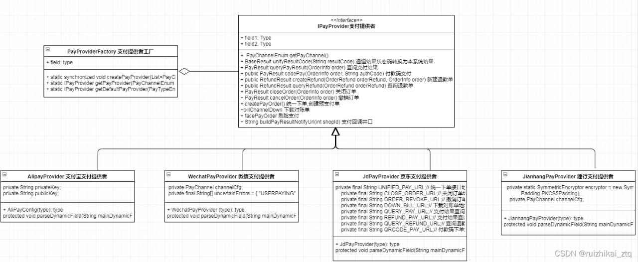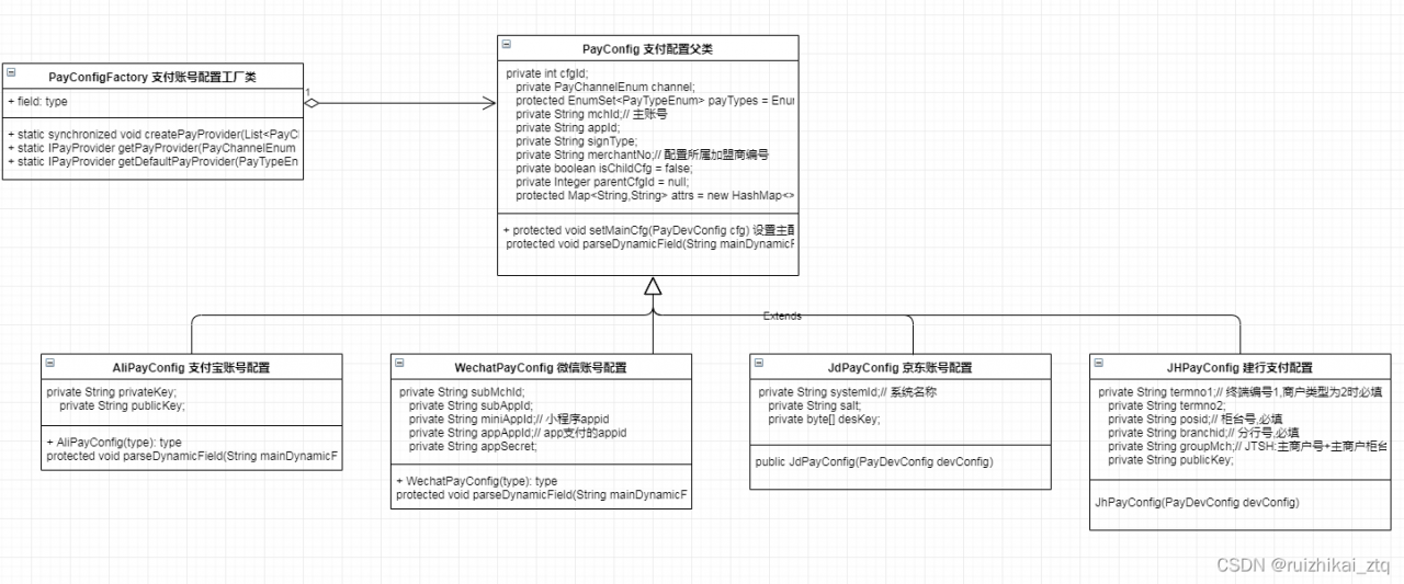 每种支付类型对应一种支付配置,依据支付方式、商户号等,通过支付配置工厂获取相对应的支付配置,类图如下所示: