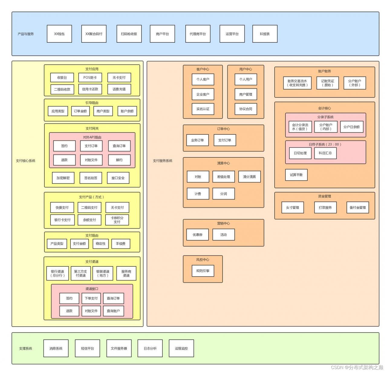 聚合支付系统有产品与服务、支付核心系统、支撑系统构成。