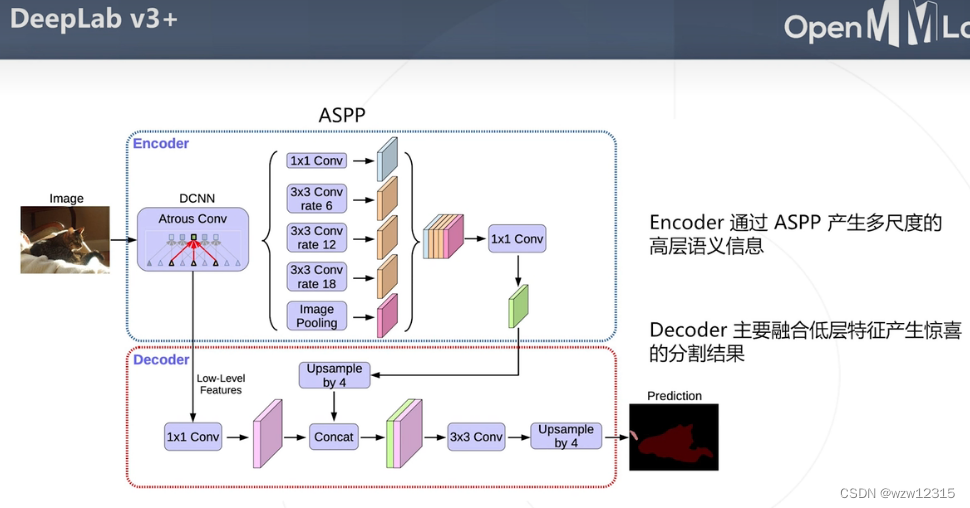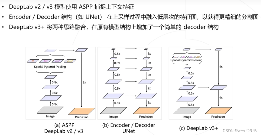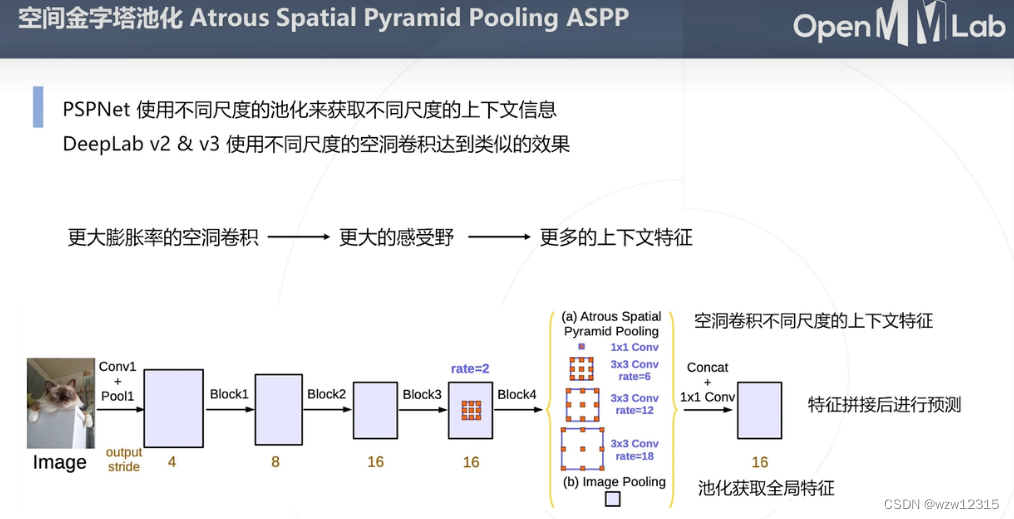 (c)使用多尺度的空洞卷积(ASPP模块)来捕捉上下文信息。