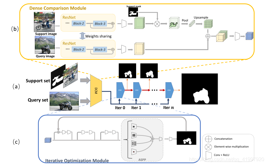 论文提出了一个新的框架来解决小样本语义分割问题。 我们首先在1-shot设置中首先说明我们的模型而不失一般性。 我们的网络由两个模块组成: