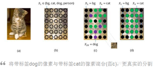 考虑通过训练模型为每个像素分配类来分割图像。如果我们的模型不完美,我们可能会得到自然界不可能得到的噪声分割结果(如图中所示,狗像素与猫像素混合)。
