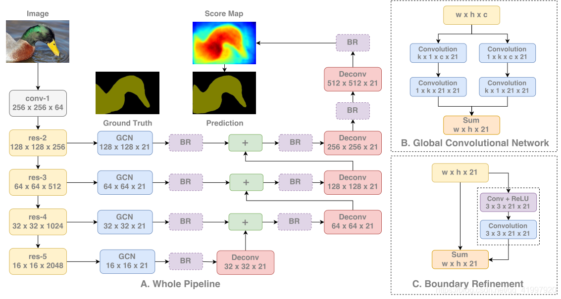 接下来谈结构,ResNet(不带空洞卷积)组成了整个结构的编码器部分,同时GCN网络和反卷积层组成了解码器部分。该结构还使用了一种称作边界细化(Boundary Refinement,BR)的简单残差模块。