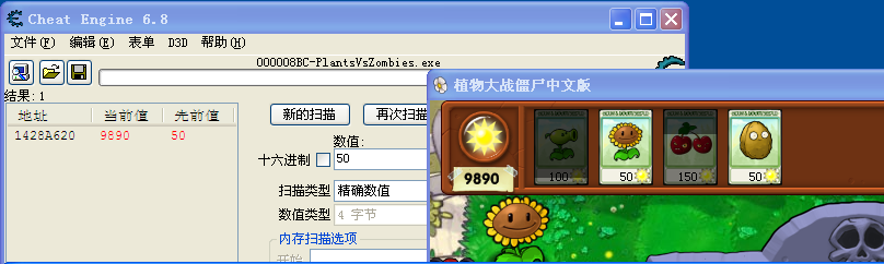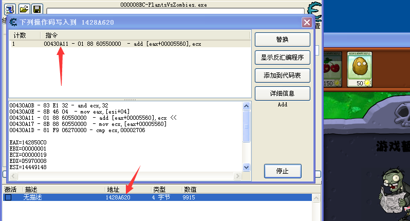 2.接着我们选择最下方的地址列表,然后按下【F6键】,也就是下一个硬件写入断点,然后回到游戏等待阳光出现并点击阳光,此时CE会出现以下代码,我们只需要记下【00430A11】这个内存地址,然后直接关闭CE吧,短期内用不到了。