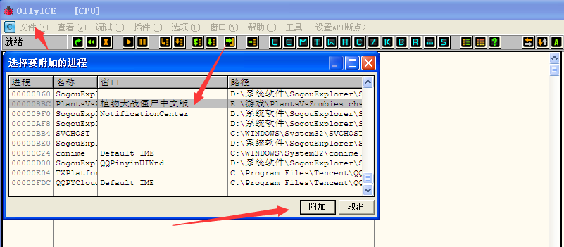 3.打开OD,然后我们直接附加植物大战僵尸的游戏进程,点击【文件】然后点击【附加】选择植物大战僵尸进程就好。