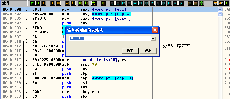 4.附加完成后,我们的游戏会被OD暂停运行,此时我们直接按下【F12】让游戏正常的运行,默认情况下会停在系统领空,我们直接按下【Ctrl + G】输入【00401000】来到程序领空。