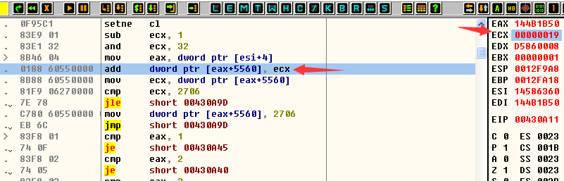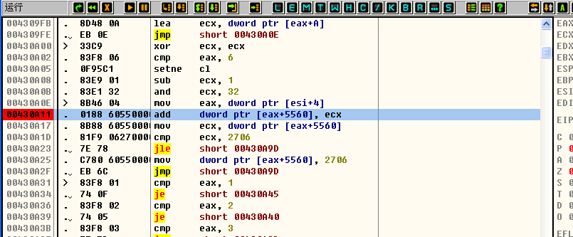 6.紧接着我们回到游戏,然后等待阳光的出现,当阳光出现后我们点击阳光,OD会自动断在00430A11的位置,其中ecx就是要增加的阳光数。