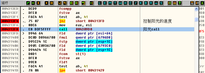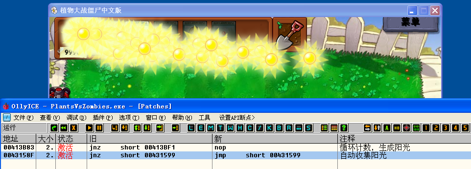7.我们在JNZ和CALL的两处位置下断点,然后运行程序,当我们点击阳光时会断在JNZ的位置,如果把JNZ用NOP填充的话,会发现当我们再次点击阳光的时候阳光会迅速的被回收没有了动画。