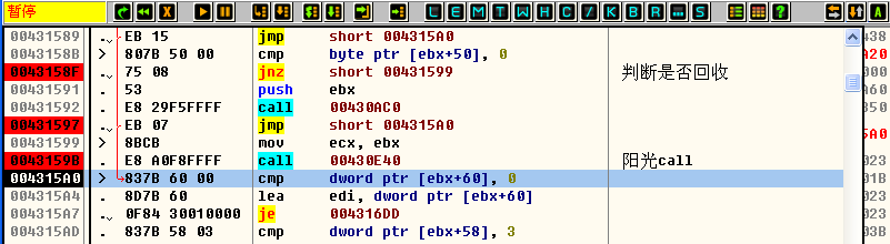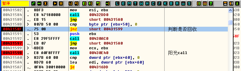9.下好断点,回到游戏等待阳光下落我们回收,此时OD会断下,我们运行OD发现会一直被断在【0043158F】只要阳光没有收回就会一直断下,此处的跳转并没有实现,因为我们没有去点击阳光,这里可以得出如果点击了阳光JNZ则会跳转成立,否则不成立等待用户点击回收阳光。
