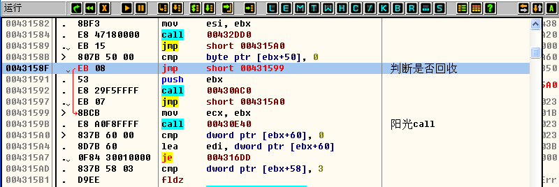 10.我们取消所有的断点,然后尝试把JNZ跳转改成JMP无条件跳转,让其只要一出现阳光就自动的触发回收的CALL试试。
