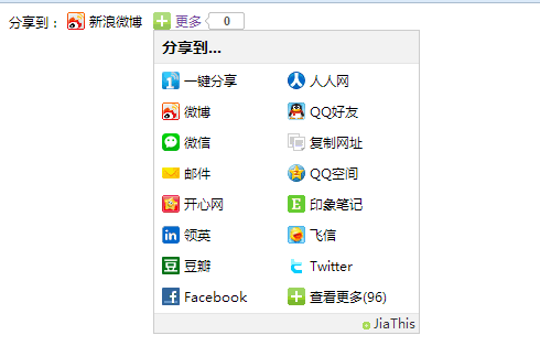 <!DOCTYPE html PUBLIC "-//W3C//DTD XHTML 1.0 Transitional//EN" "http://www.w3.org/TR/xhtml1/DTD/xhtml1-transitional.dtd"> <html xmlns="http://www.w3.org/1999/xhtml"> <head> <meta http-equiv="Content-Type" content="text/html; charset=utf-8" /> <title>无标题文档</title> </head> <body> <!-- JiaThis Button BEGIN --> <div id="ckepop"> <span class="jiathis_txt">分享到:</span> <a class="jiathis_button_tsina">新浪微博</a> <a href="http://www.jiathis.com/share" class="jiathis jiathis_txt jiathis_separator jtico jtico_jiathis" target="_blank">更多</a> <a class="jiathis_counter_style"></a> </div> <script type="text/javascript" src="http://v2.jiathis.com/code/jia.js" charset="utf-8"></script> <!-- JiaThis Button END --> </body> </html>