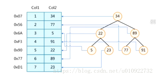 如果对Col2字段加上索引后,我们假设使用最简单的二叉树作为索引存储方式,再次查找where Col2 = 22的记录这次只需要查找2次就能找到目标记录,效率提高十分明显。