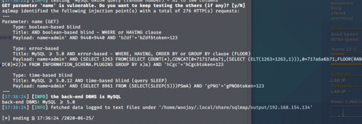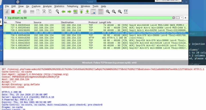 确认了注入的存在,并且在wireshark中观察到token被sqlmap自动更新