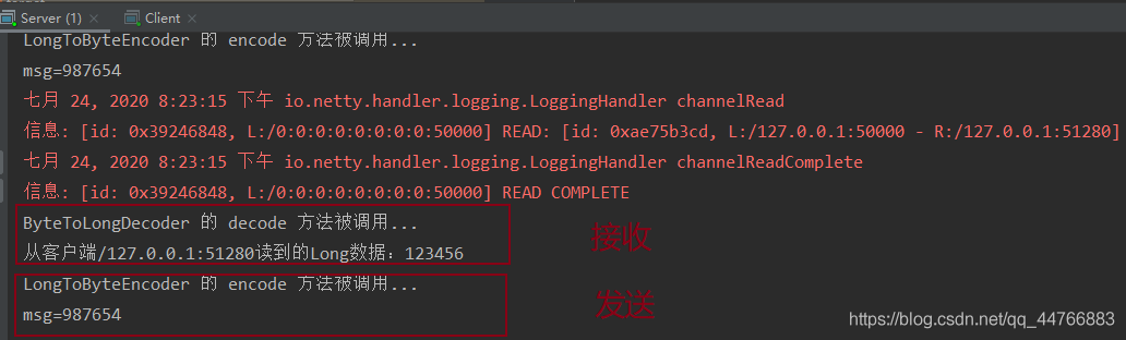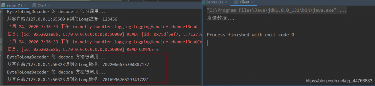 当发送的是字符串的时候,客户端不会经过编码器,服务端会将二进制解码成Long。又因为我发送的字符有16个字节,所以解码的时候回进行两次解码