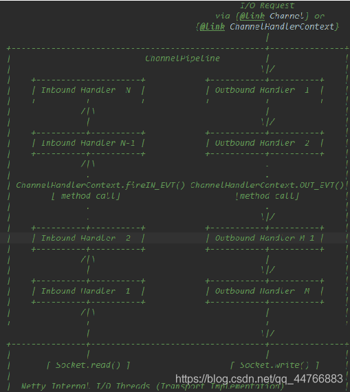 - ChannelPipeline 提供了 ChannelHandler 链的容器。以客户端应用程序为例,如果事件的运动方向是从客户端到 服务端的,那么我们称这些事件为出站的,即客户端发送给服务端的数据会通过 pipeline 中的一系列 ChannelOutboundHandler,并被这些 Handler 处理,反之则称为入站的