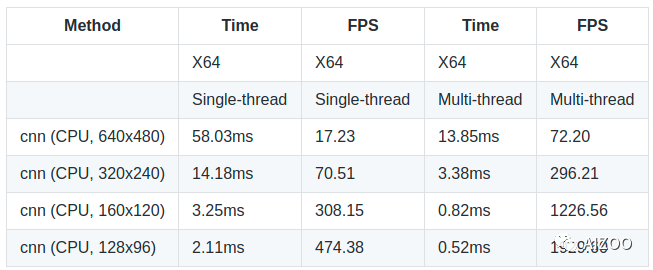 前几天元峰已经对该项目进行过一次介绍了,该项目使用一个SSD架构的人脸检测模型,在酷睿 i7 的CPU上,320x240分辨率下可以达到296.21 FPS,下图是该项目在不同分辨率和单线程下的速度概览。