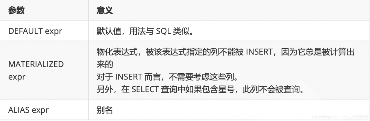 参数说明:表字段支持三种默认值表达式的定义方法,分别是DEFAULT、MATERIALIZED和ALIAS。无论使用哪种形式,表字段一旦被定义了默认值,它便不再强制要求定义数据类型,因为 ClickHouse 会 根据默认值进行类型推断。如果同时对表字段定义了数据类型和默认值表达式,则以明确定义的数据类型为主。