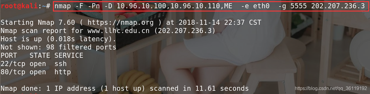 -D <decoy1,decoy2[,ME],...>: 用一组 IP 地址掩盖真实地址,其中 ME 填入自己的 IP 地址。