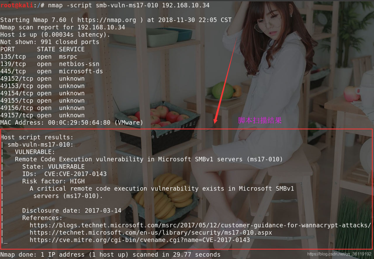 例如:nmap -script smb-vuln-ms17-010 192.168.10.34 #可以探测该主机是否存在ms17_010漏洞
