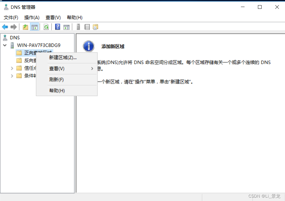 - 选中“WIN-UI2CAS6PFQT”下的正向查找区域,右击,单机“新建区域”。